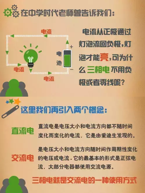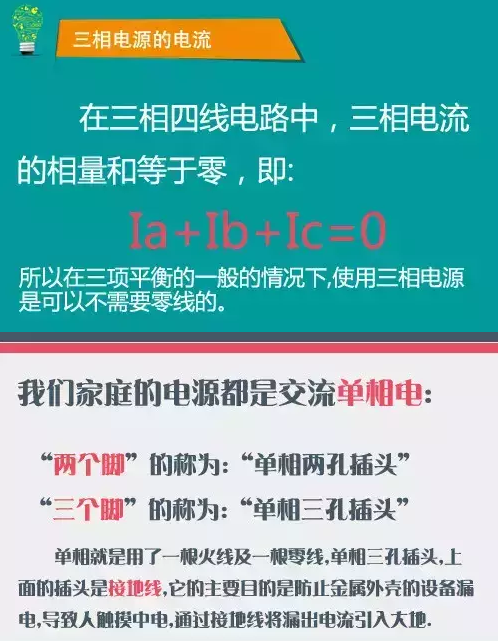 例如电动机,都采用三相交流电,也就是经常提到的三相四线制。而在日常生活中,多使用单相电源,也称为照明电。当采用照明电供电时,使用三相电其中的一相对用电设备供电,例如家用电器,而另外一根线是三相四线之中的第四根线,也就是其中的零线,该零线从三相电的中性点引出。